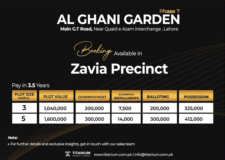 Al Ghani Garden Phase 7 Zavia Block offers an easy installment payment plan of 3.5 years.