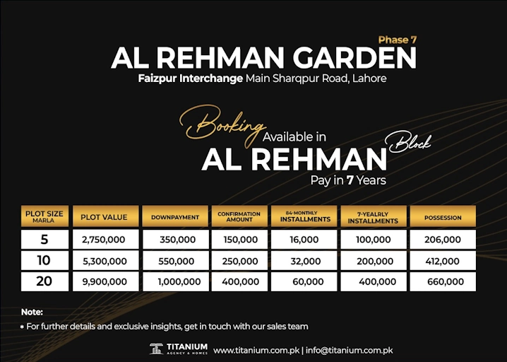 Al Rehman Garden Phase 7, Lahore offers a 7-year easy installment payment plan.