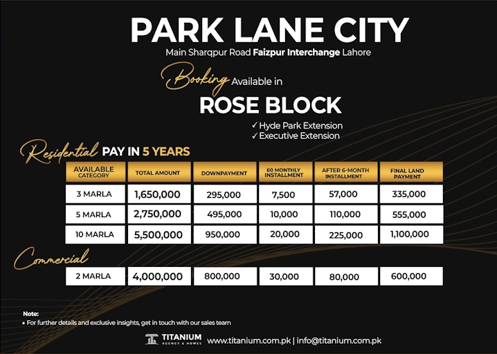 Park Lane City Lahore offers a 5-year easy installment plan with a small down payment. Possession is given after development and partial payment.